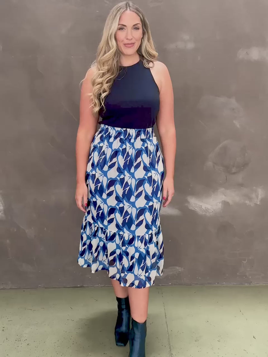 We don’t often make skirts but when we have they have all sold out in record time and our new Stephanie looks set to be no exception. Made in the same blue and white abstract leaf print as our Louise dress, this floaty midi length skirt was a favourite with everyone at our recent photoshoot.