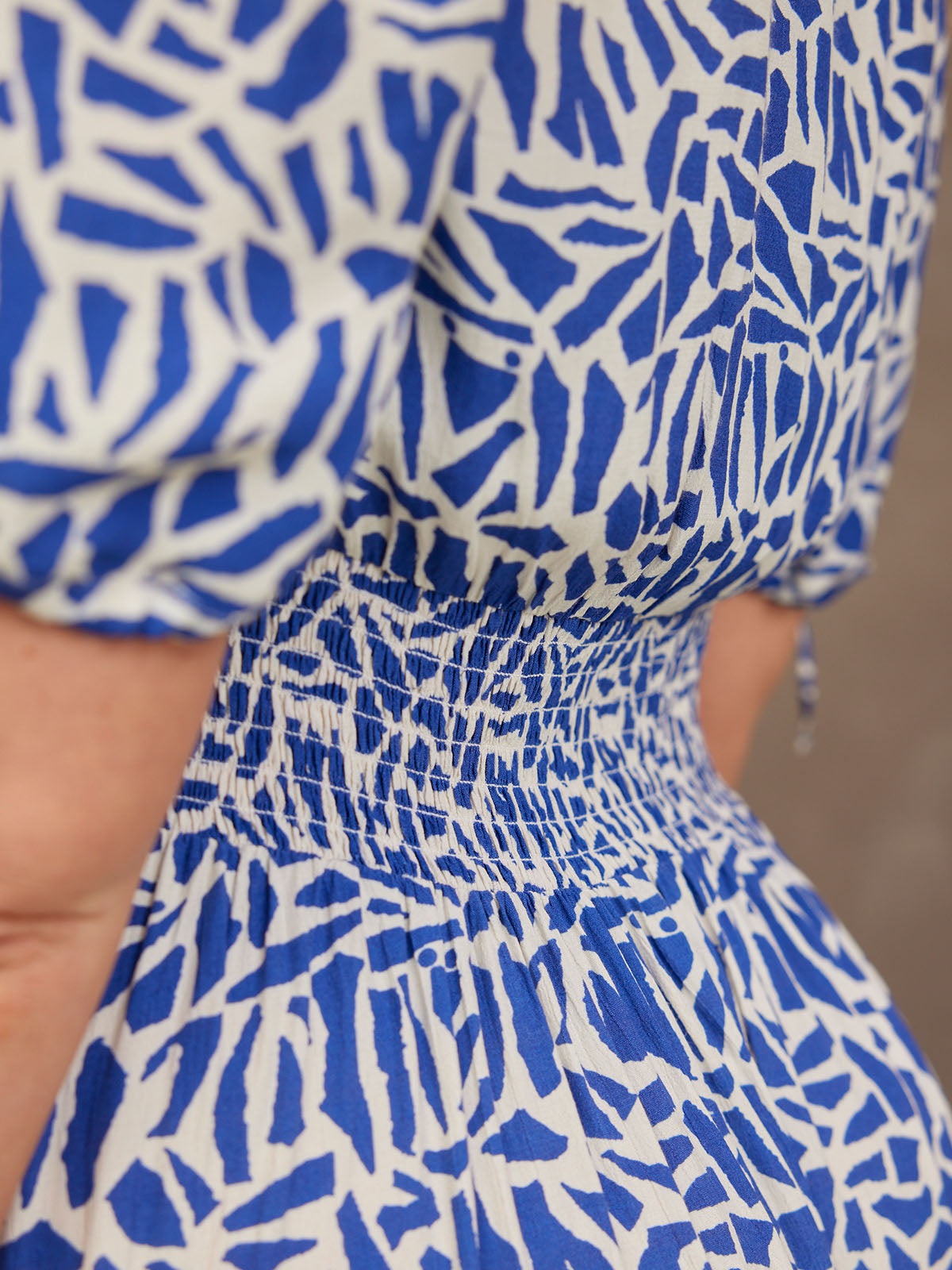 The blue and white viscose crepe fabric is a beautiful light floaty material that flatters all, and feels amazing on. With adjustable tie detail cuffs, our new season Maddie has short sleeves which makes it even more versatile.