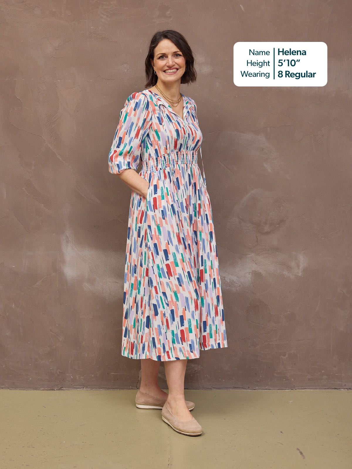 An incredibly popular dress in previous collections, the Vera has sold out repeatedly. We predict the new stunning sustainable brushstroke print will also be a big hit. The brushstroke is designed to be eyecatching but also easy to style and wear at the same time