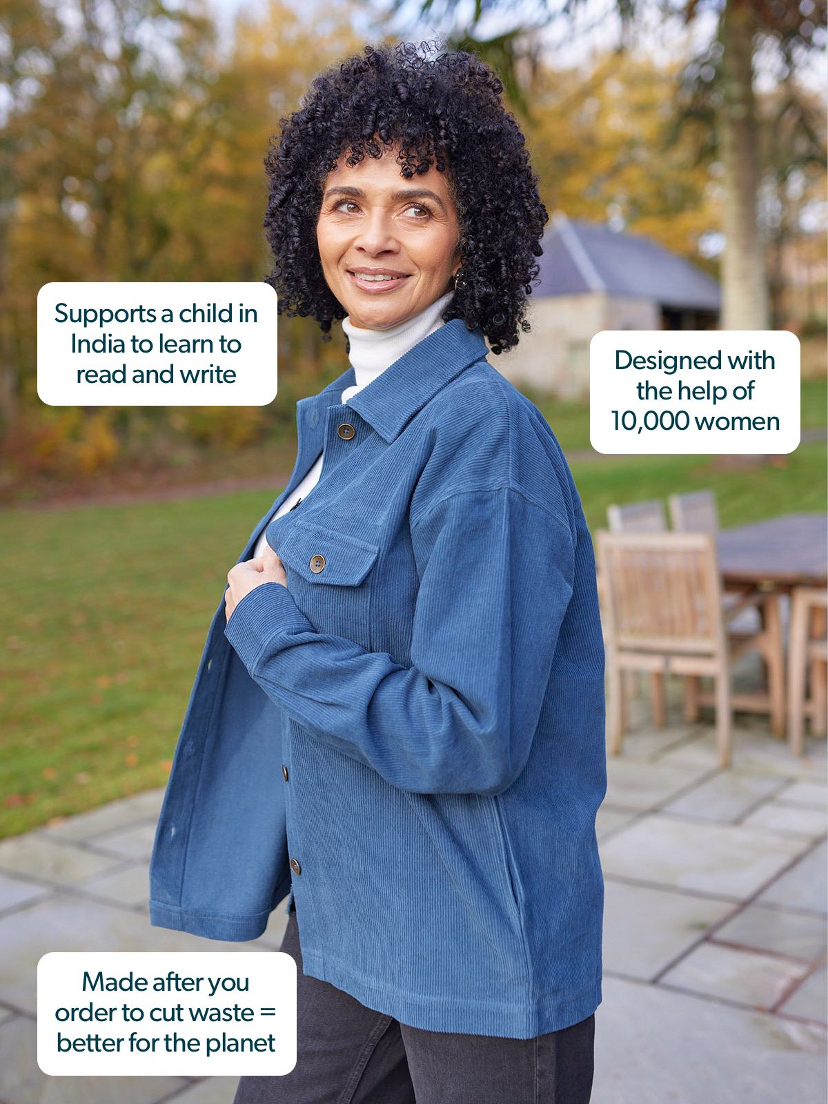 The most requested product for this collection is the sustainable corduroy shacket, which comes in two colours; Green and Blue, and with a million ways to style. Over 10,000 women have helped us design this perfect-for-layering cord shacket with a slightly oversized fit, making it easy to wear with almost anything.